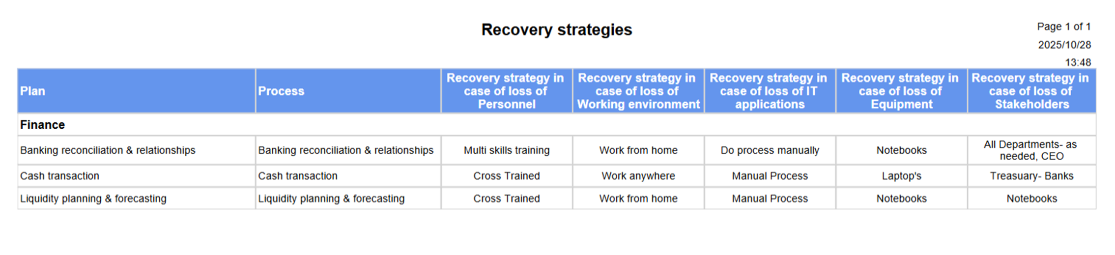 The Action plans that were created from the BC/DR are displayed. The activities associated with the Action plans can be viewed in the Action plan lines.