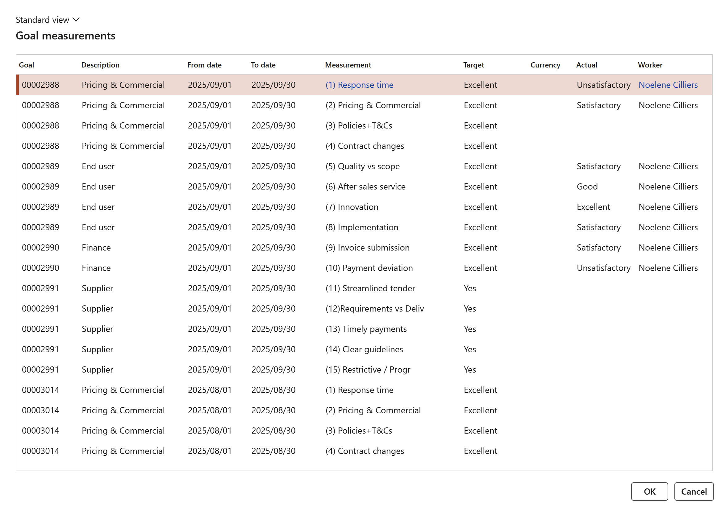 The Actual column will be updated with the values entered on the Goal after scoring/measuring has been done