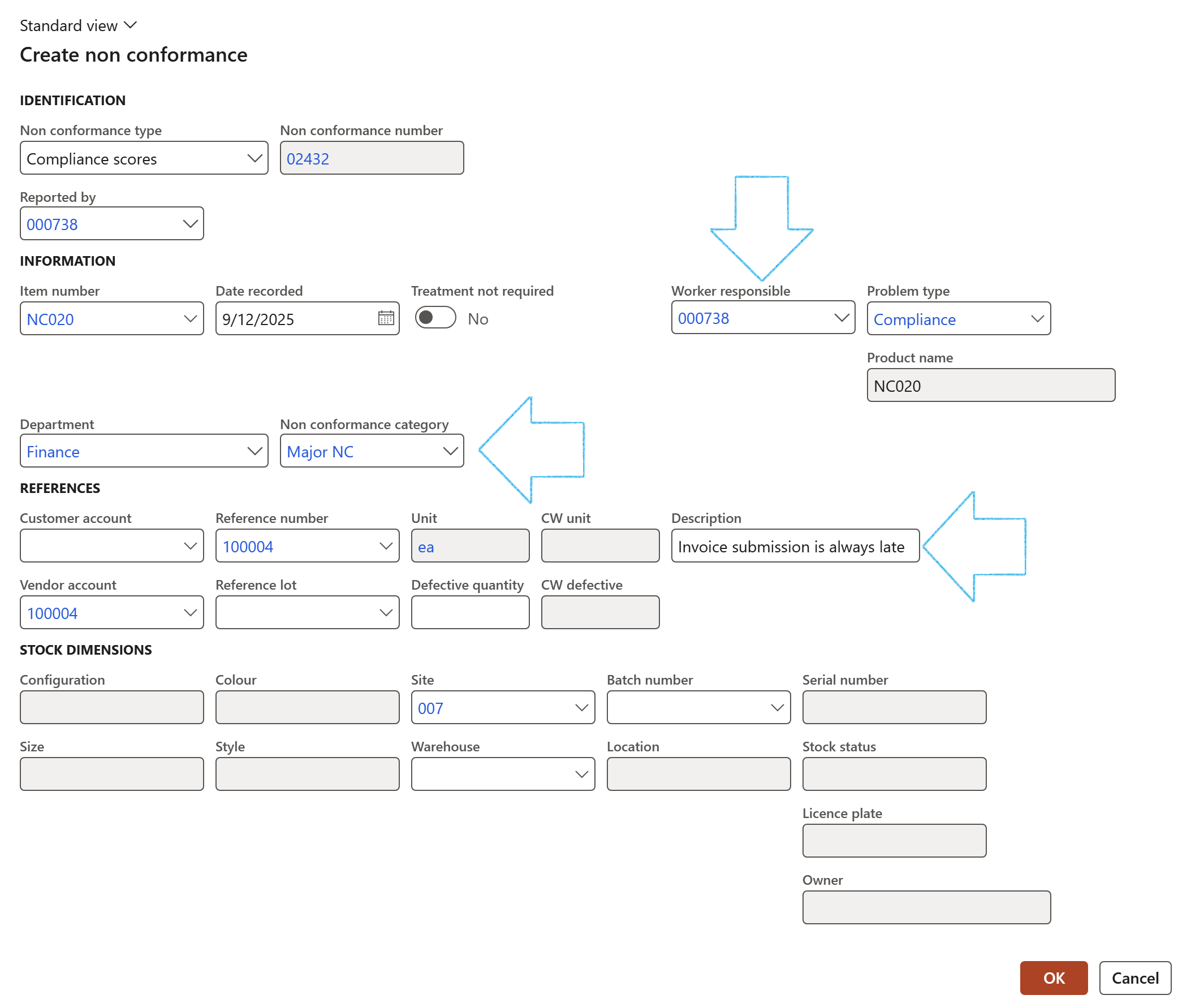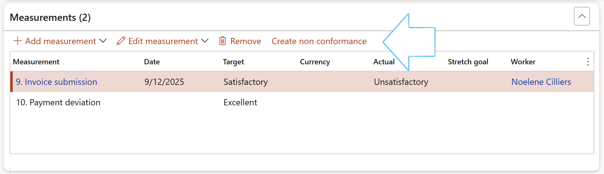 If a low score is given to a measurement, a non conformance can be created by clicking on the Create non conformance button in the Button strip. A non conformance can be followed up and corrected.