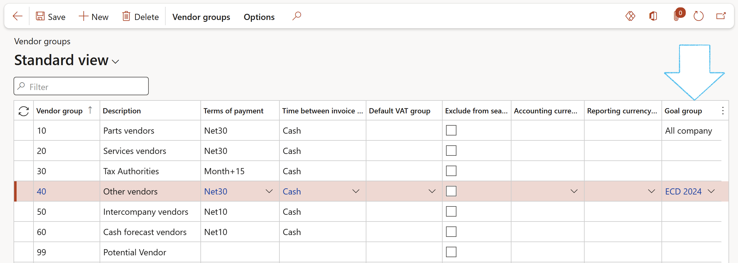 On the Vendor groups setup form, select the relevant Goal group from the dropdown list