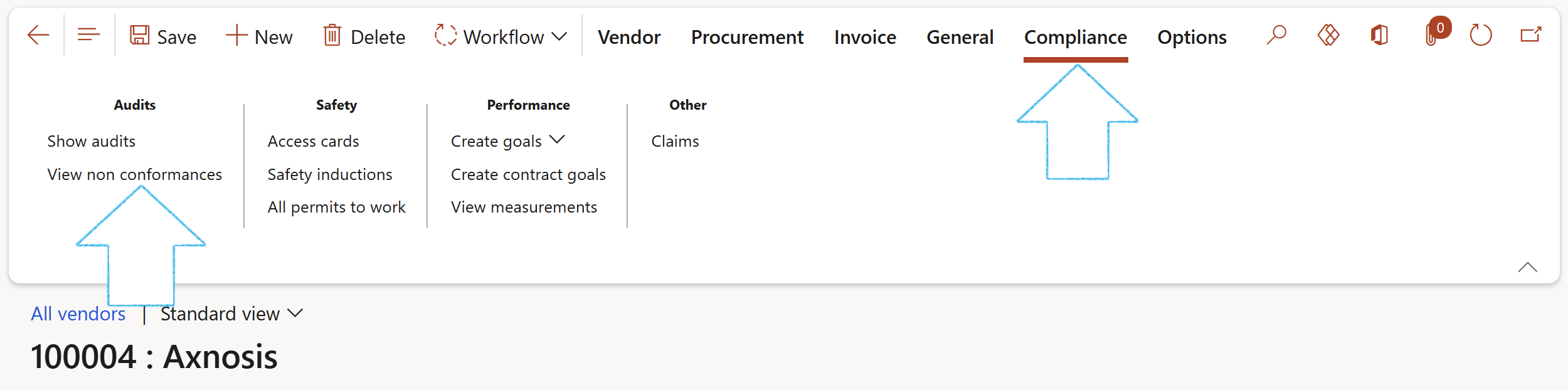 In the Action pane, open the Compliance tab and click on the View non conformances button in the Performance Audits group