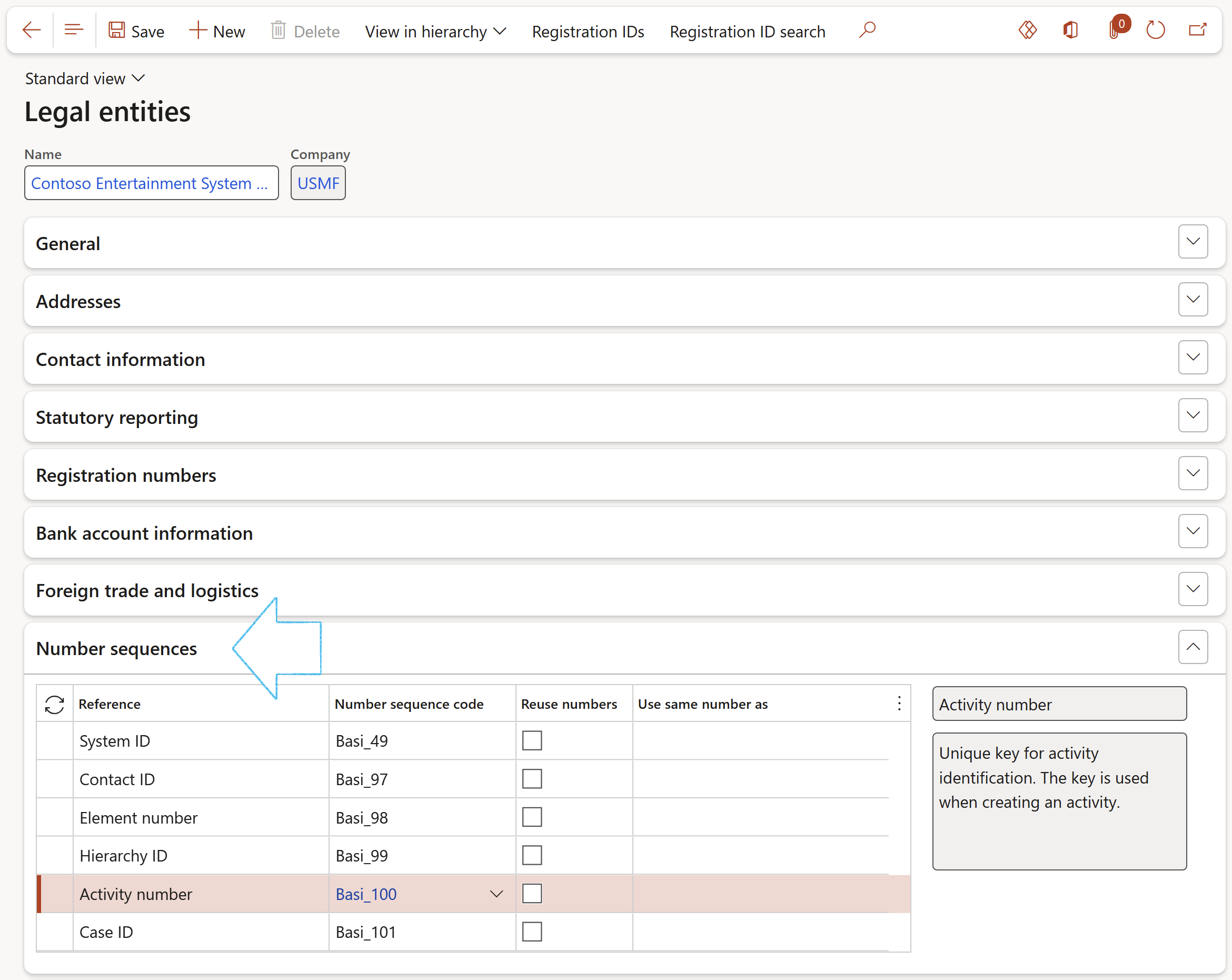When a new activity is created from the All activities list page, the number sequence specified on the Legal entity will be used. If an activity is created from a GRC/HSE form, the number sequence specified under the GRC/HSE parameters will be used
