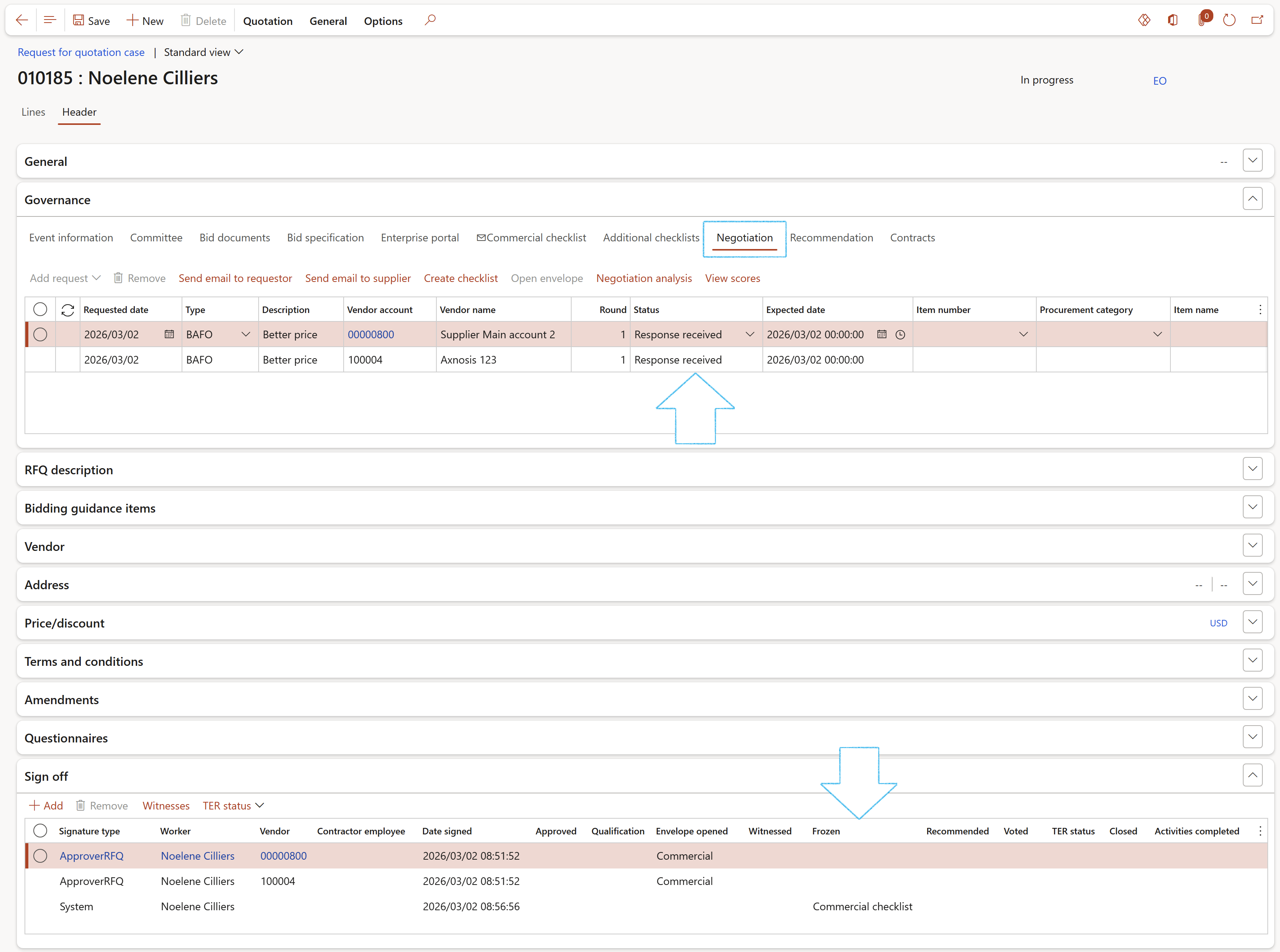 Go to: GRC > Governance > Tender management > All requests for quotations