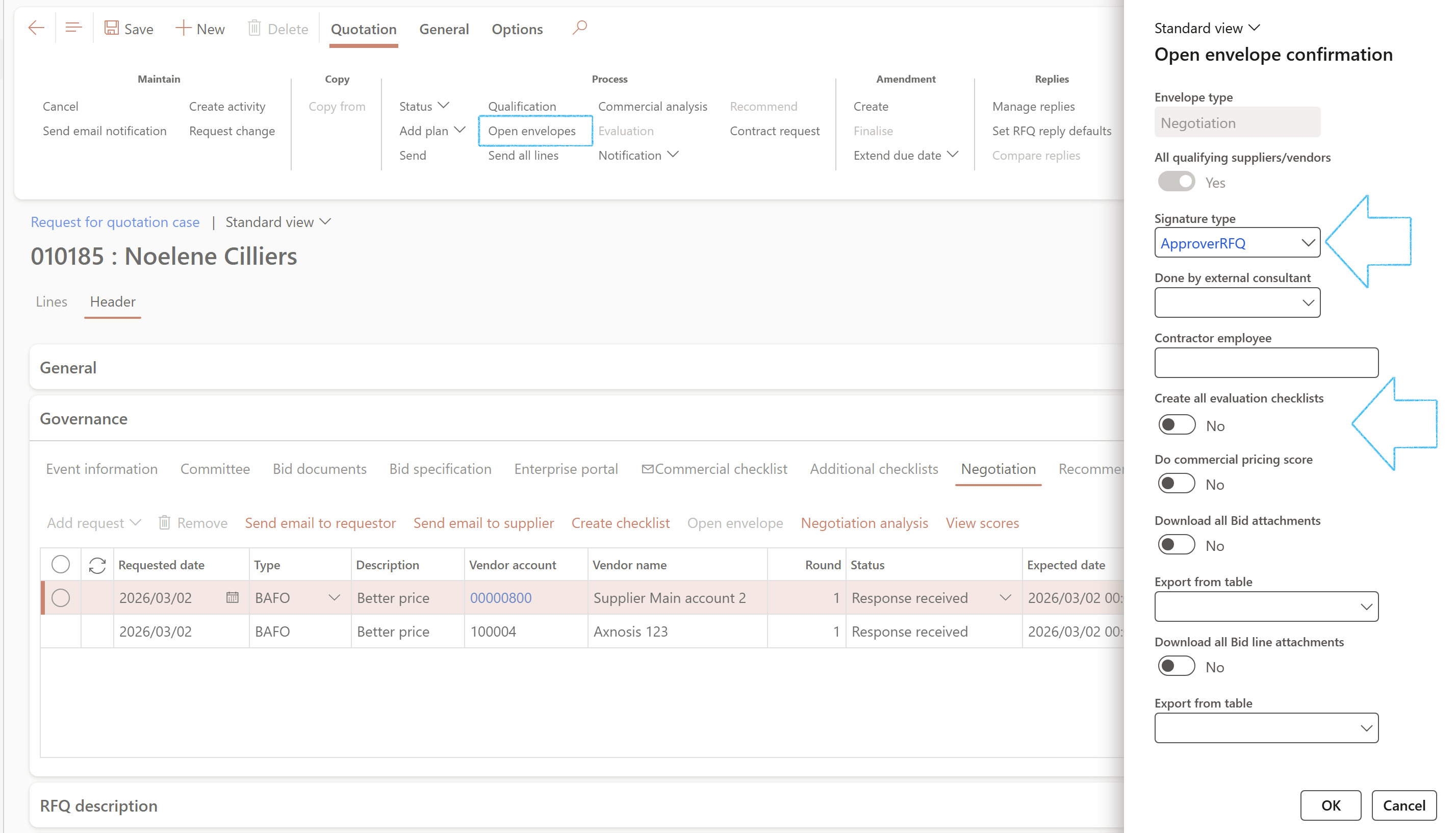 In GRC, "envelope opening" refers to the revealing of sealed supplier bids in a sourcing event, done by authorized users once the event stage allows it, often to evaluate technicals before commercials, with rules controlling who opens what and when, ensuring fairness by preventing early financial data exposure. To open them you navigate to the event, and in die Action pane, click on Open envelope button, select suppliers and choose to open.