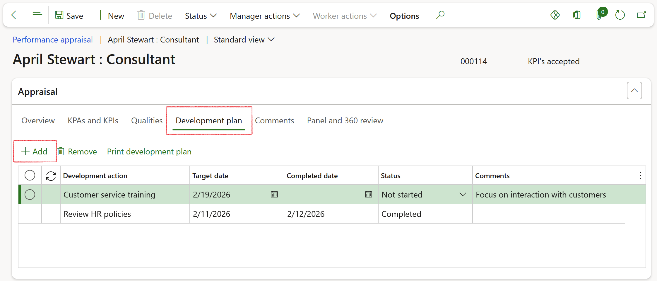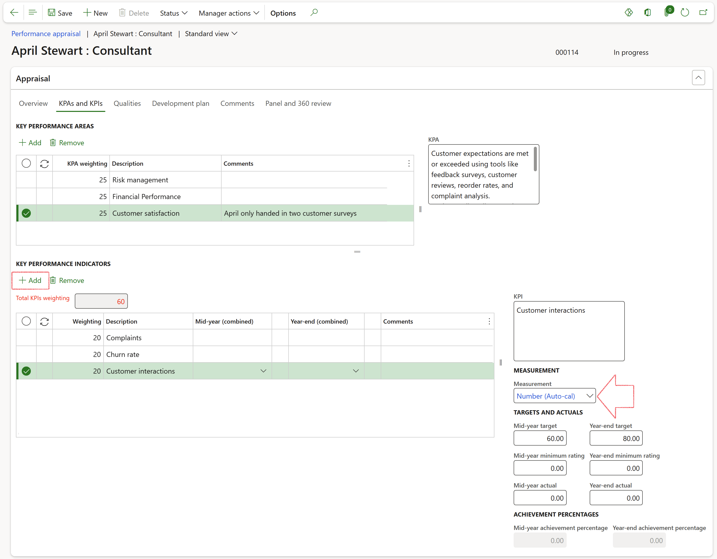 While the appraisal status is In progress and the Performance period control is still set to allow it, the manager and employee can add, modify, and remove KPAs.
