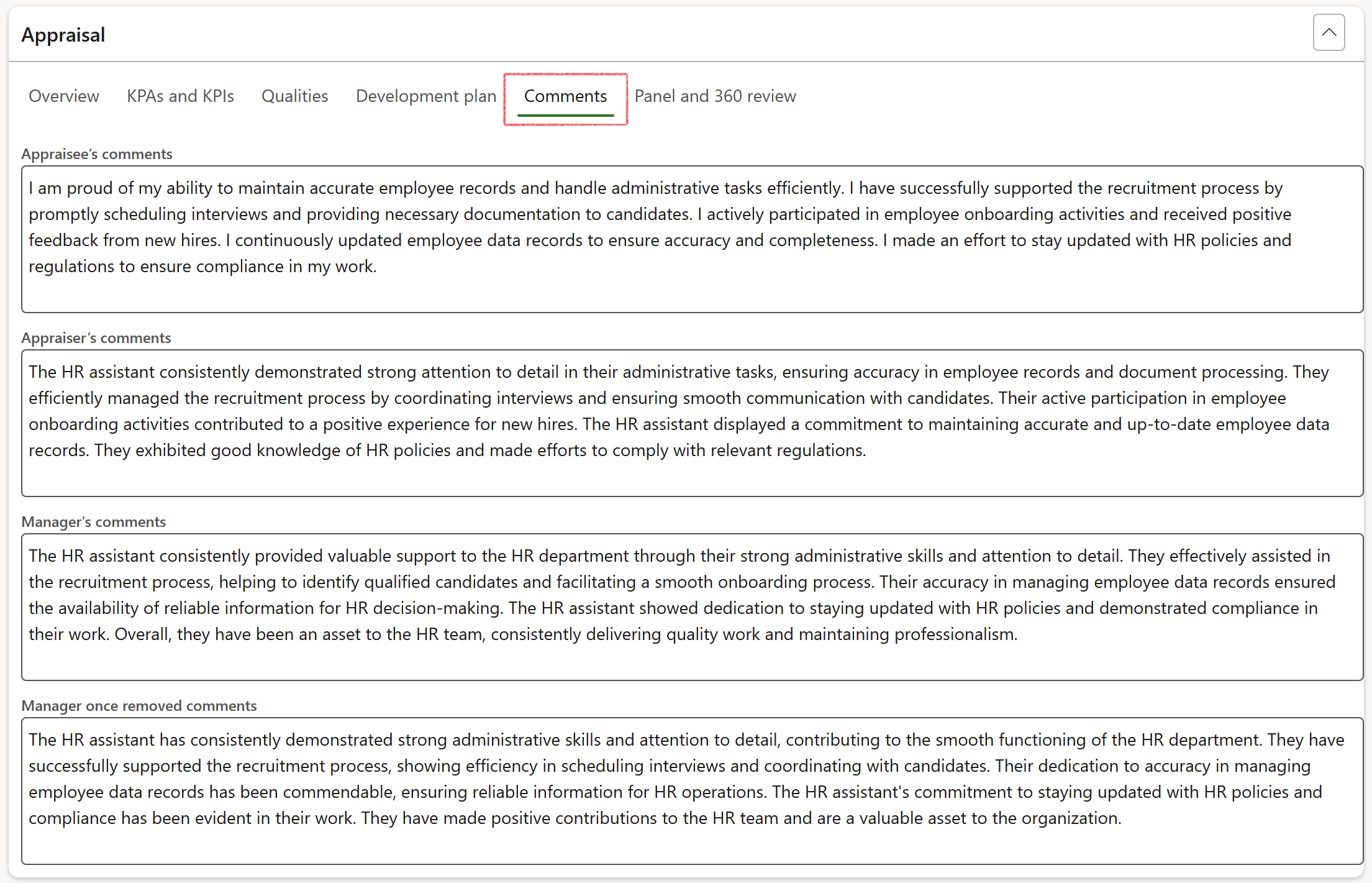 Any comments added to a KPA at any time during the performance appraisal process, will also be displayed under the KPA Comments Fast tab