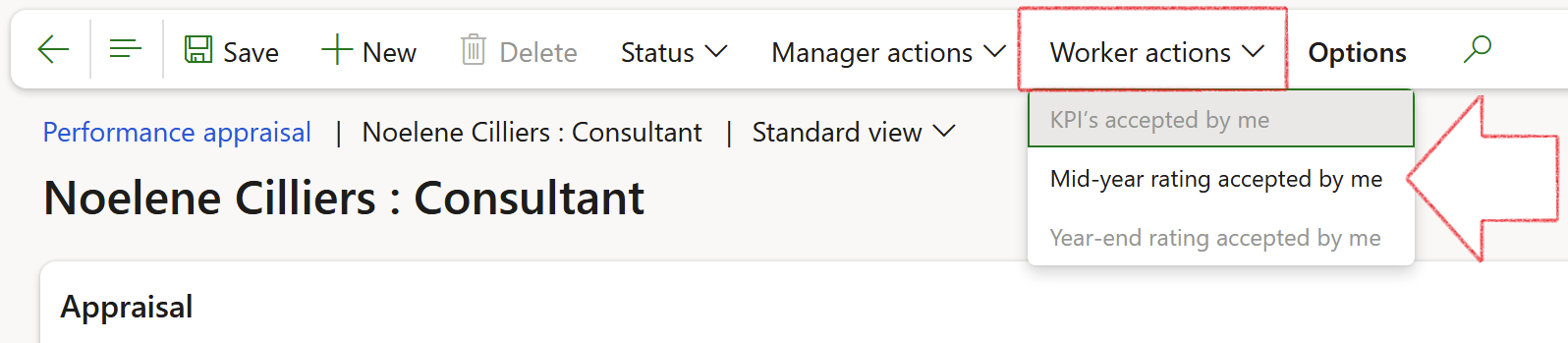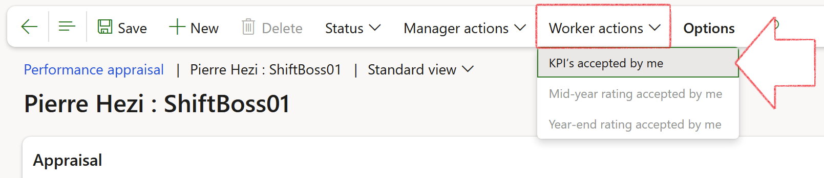 In Action pane, the employee selects KPI's accepted by me from the Worker actions dropdown list to accept the KPIs