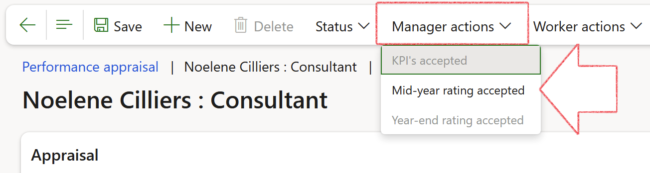 In Action pane, the manager selects Mid-year rating accepted from the Manager actions dropdown list to accept the mid-year rating. The status of the performance record will be updated to Mid-year rating accepted