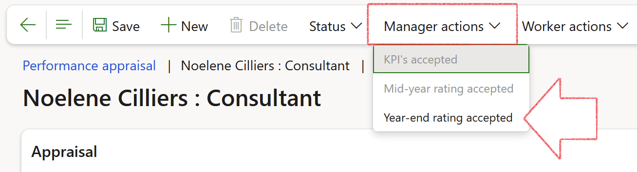 In Action pane, the manager selects Year-end rating accepted from the Manager actions dropdown list to accept the year-end rating.