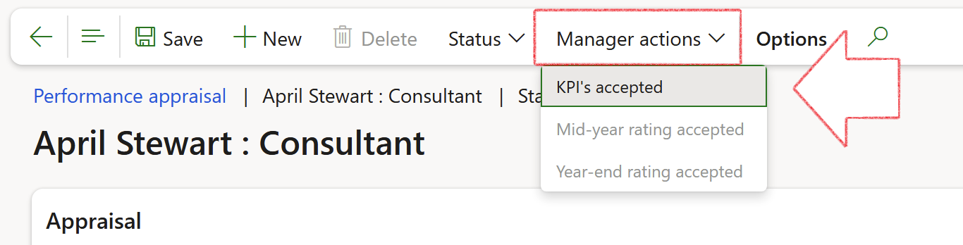 In Action pane, the manager selects KPI's accepted from the Manager actions dropdown list to accept the KPIs