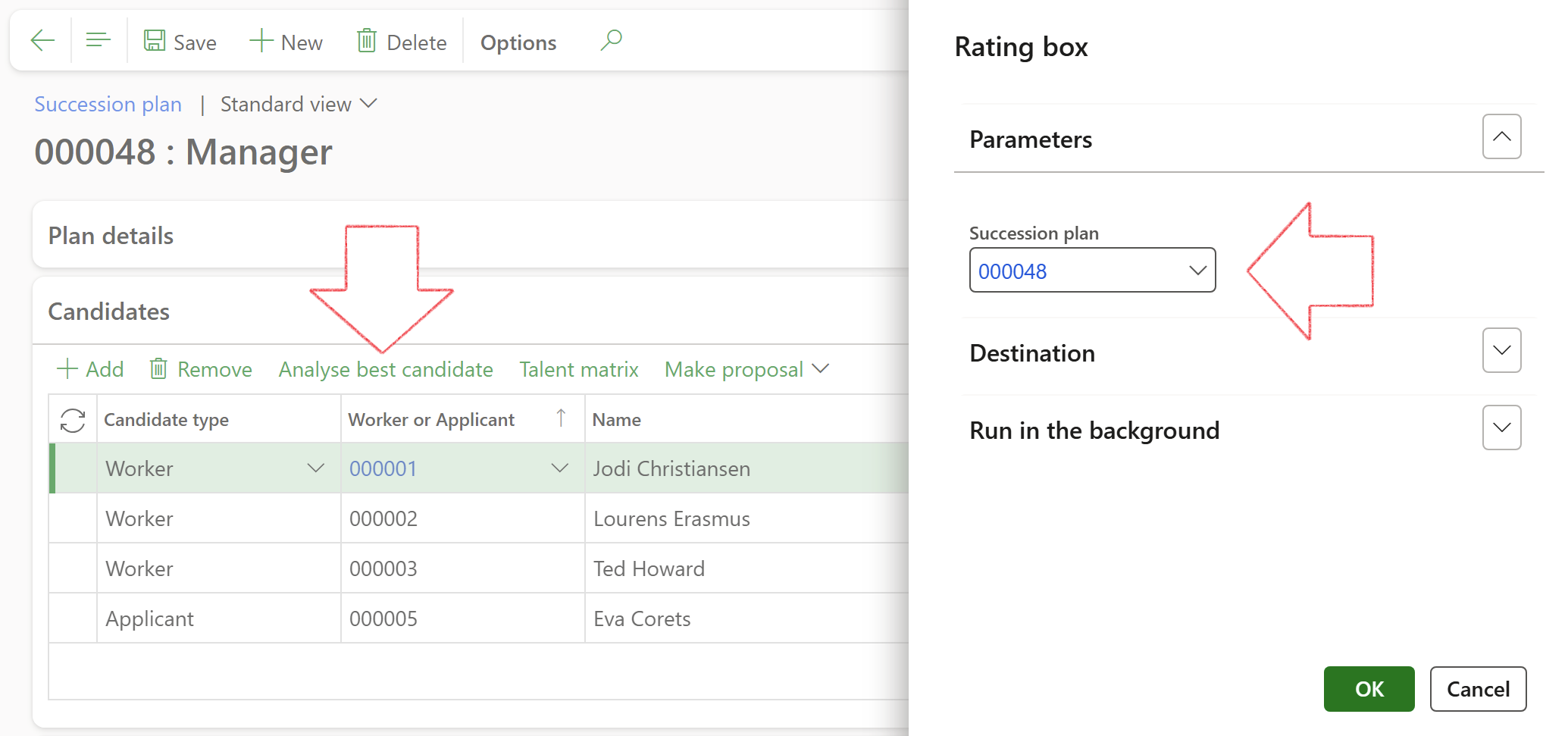 In the Rating box dialogue, the current Succession plan ID will be populated in the Parameters. Click on the OK button