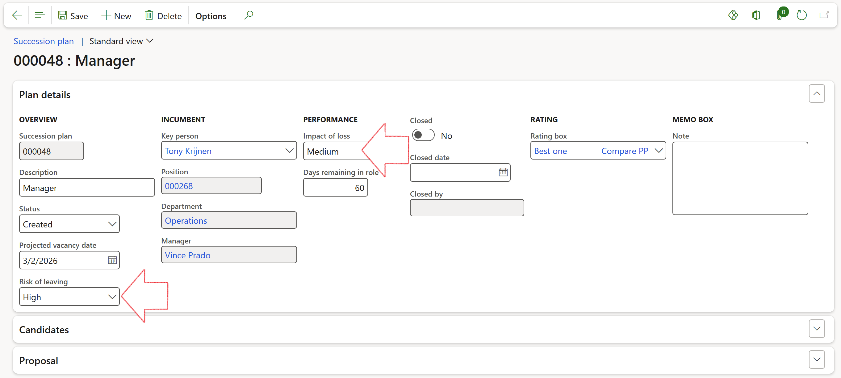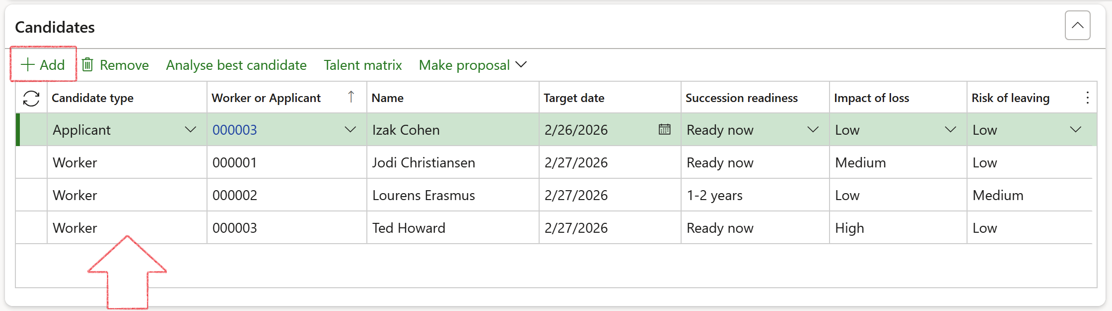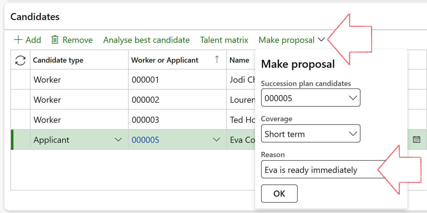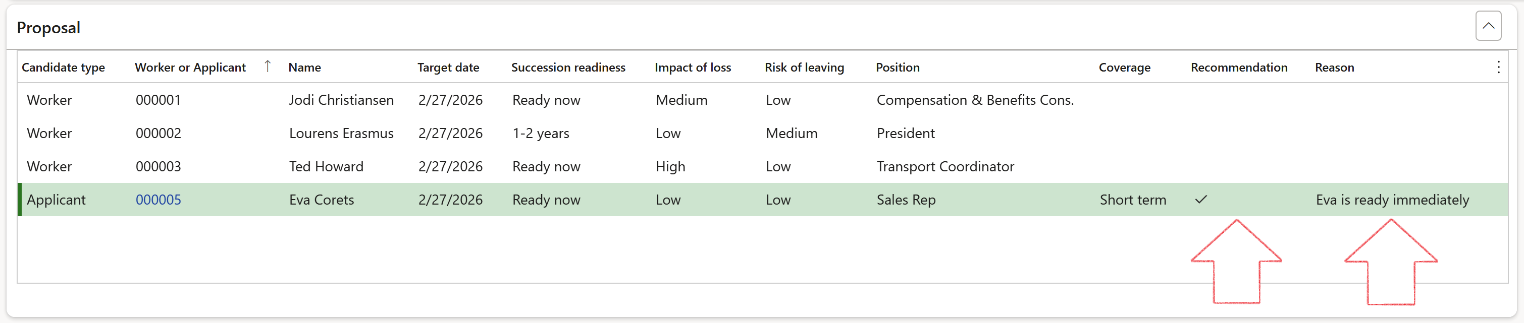 On the Succession plan, under the Proposal Fast tab, you can see which workers or applicants were selected as best candidates, and what the final recommendations where on each one