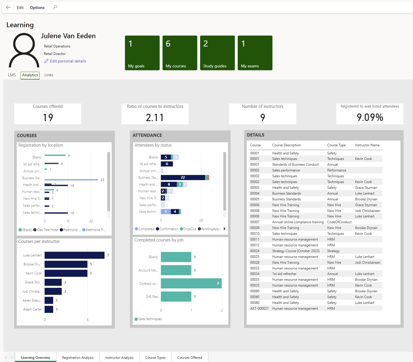 In addition to learning content, statistics regarding all courses can be seen when selecting the Analytics index tab in the workspace and then selecting a relevant tab for either Learning Overview; Registration Analysis; Instructor Analysis; Course Types and Courses offered
