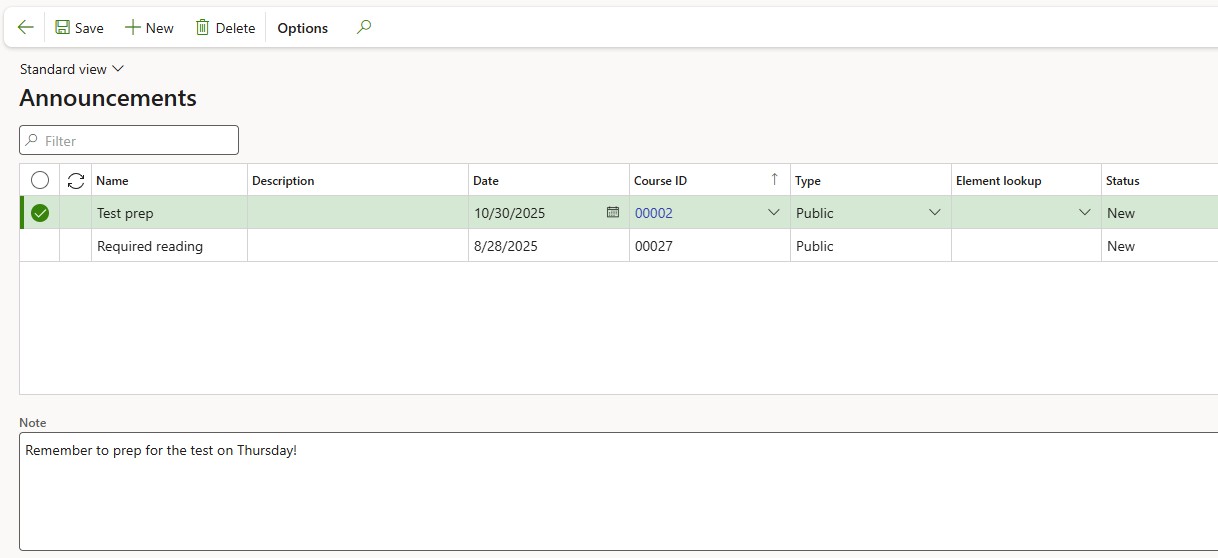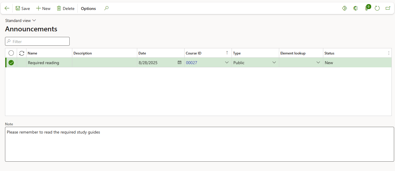 Course announcements may be added to alert participants to course information. The announcements may be added from either the Course itself or from the Course announcements menu item for Human resources.