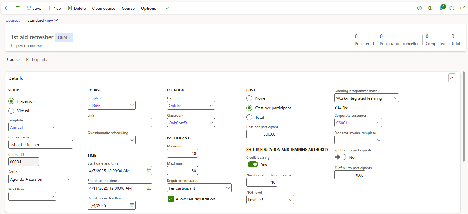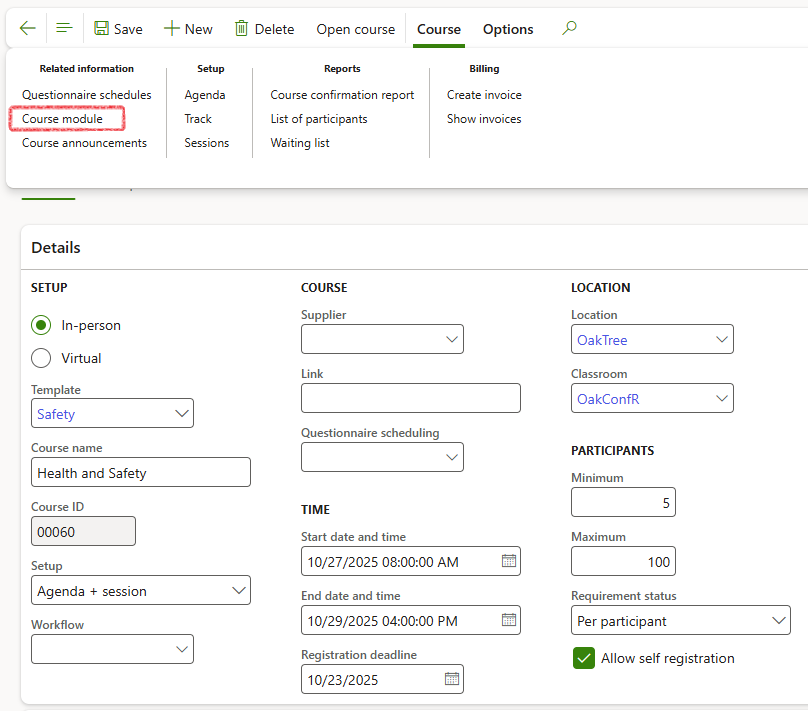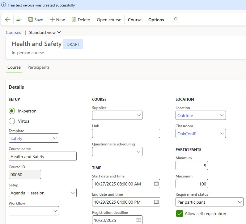 During the course setup phase, the status of the course is indicated as Draft. Additional standard D365 data may be added including Agendas and Questionnaire schedules. Once the course is ready to be published and made available to participants to be registered: