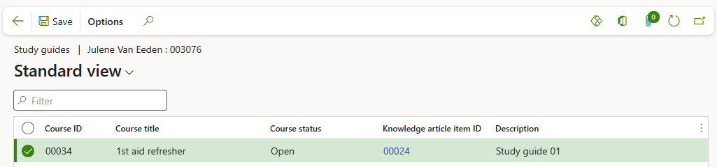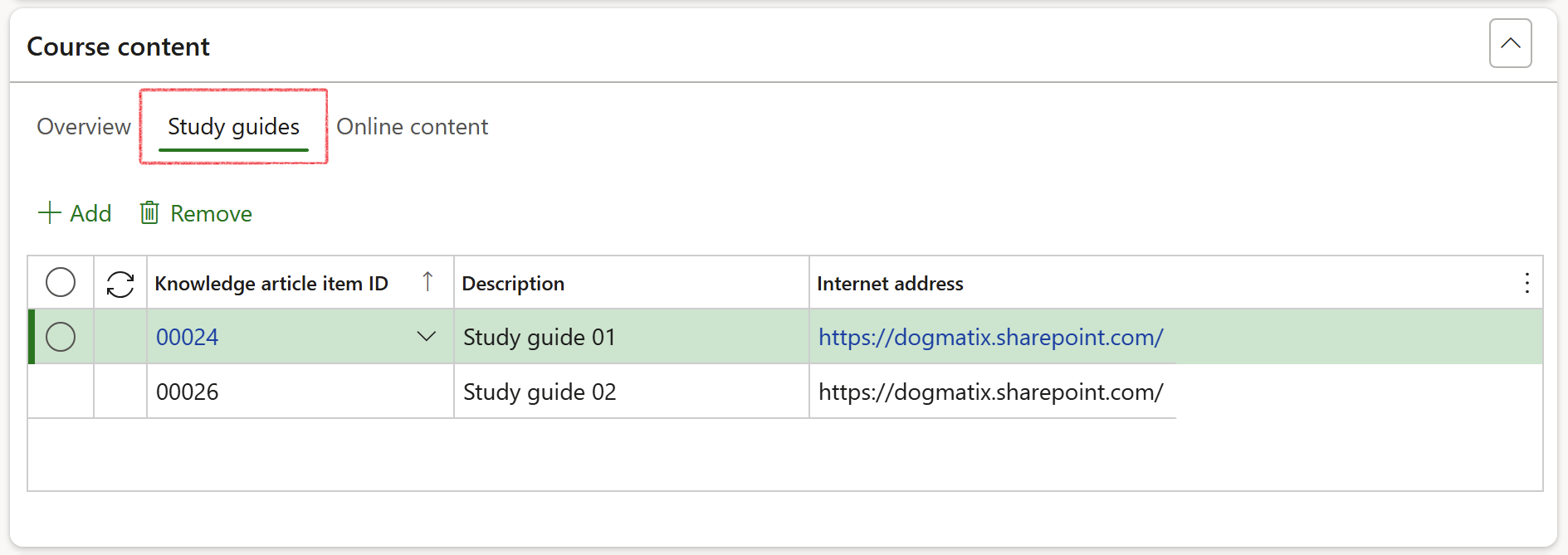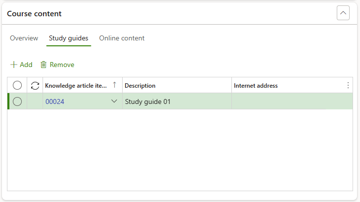 Open the Study guides Index tab to add Knowledge article items associated with the course