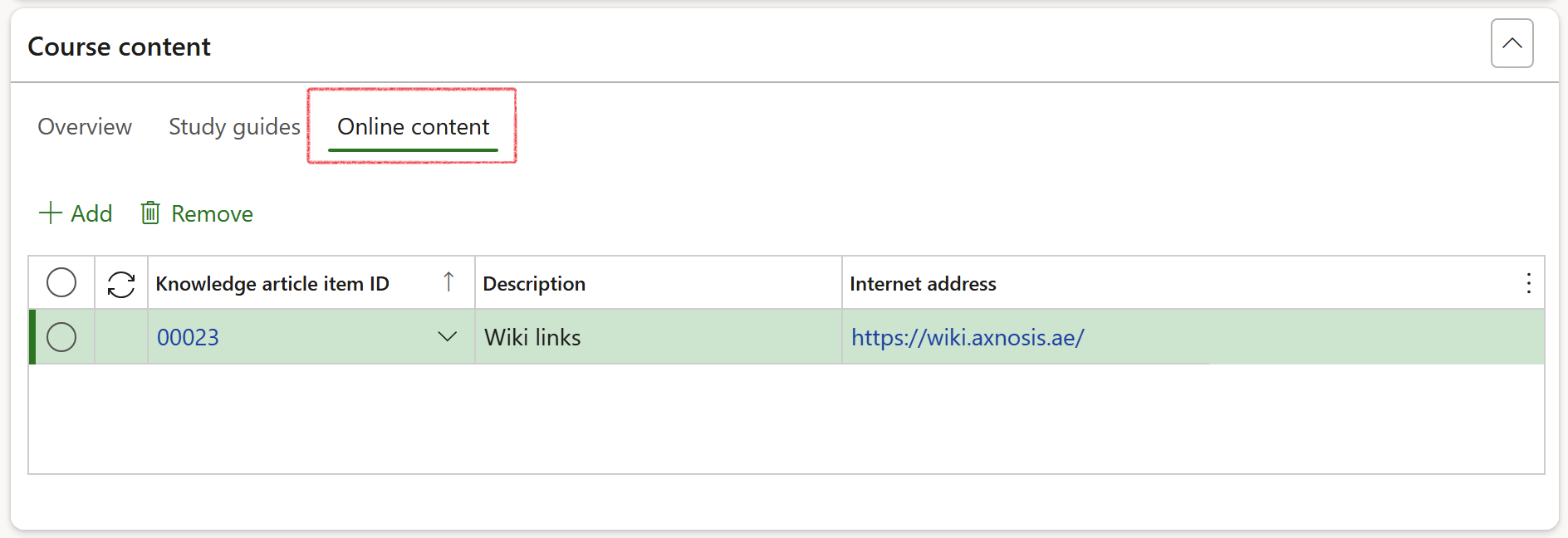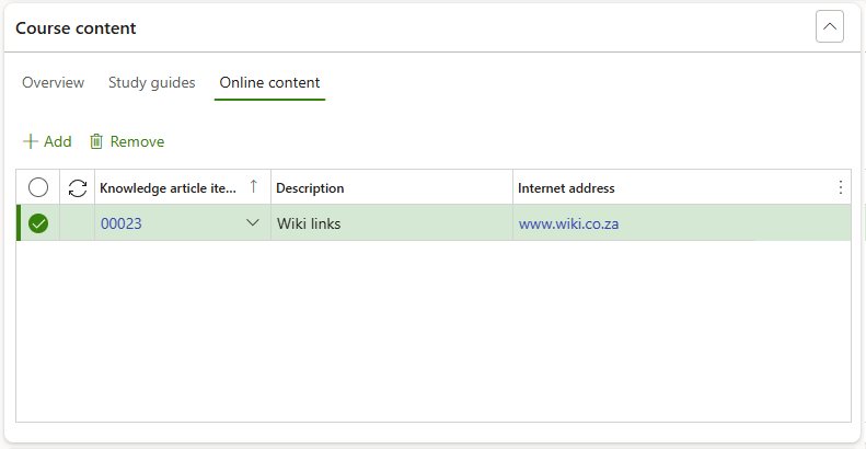 Open the Online content Index tab to add Link type knowledge article items associated with the course