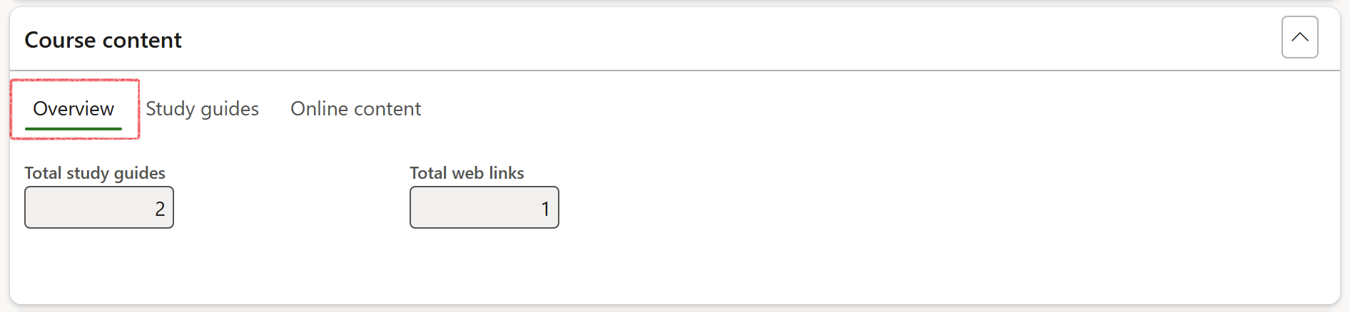 The course content Overview tab will automatically list the number of study guides and web links added