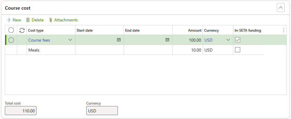 Expand the Course cost Fast tab to add costs associated with the course if applicable