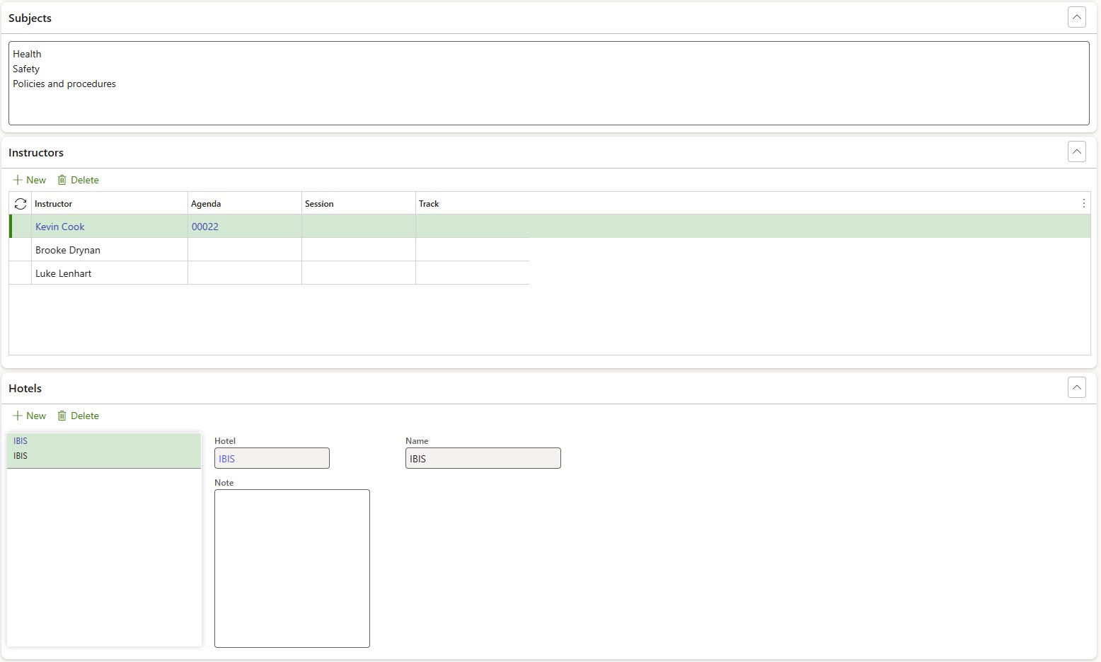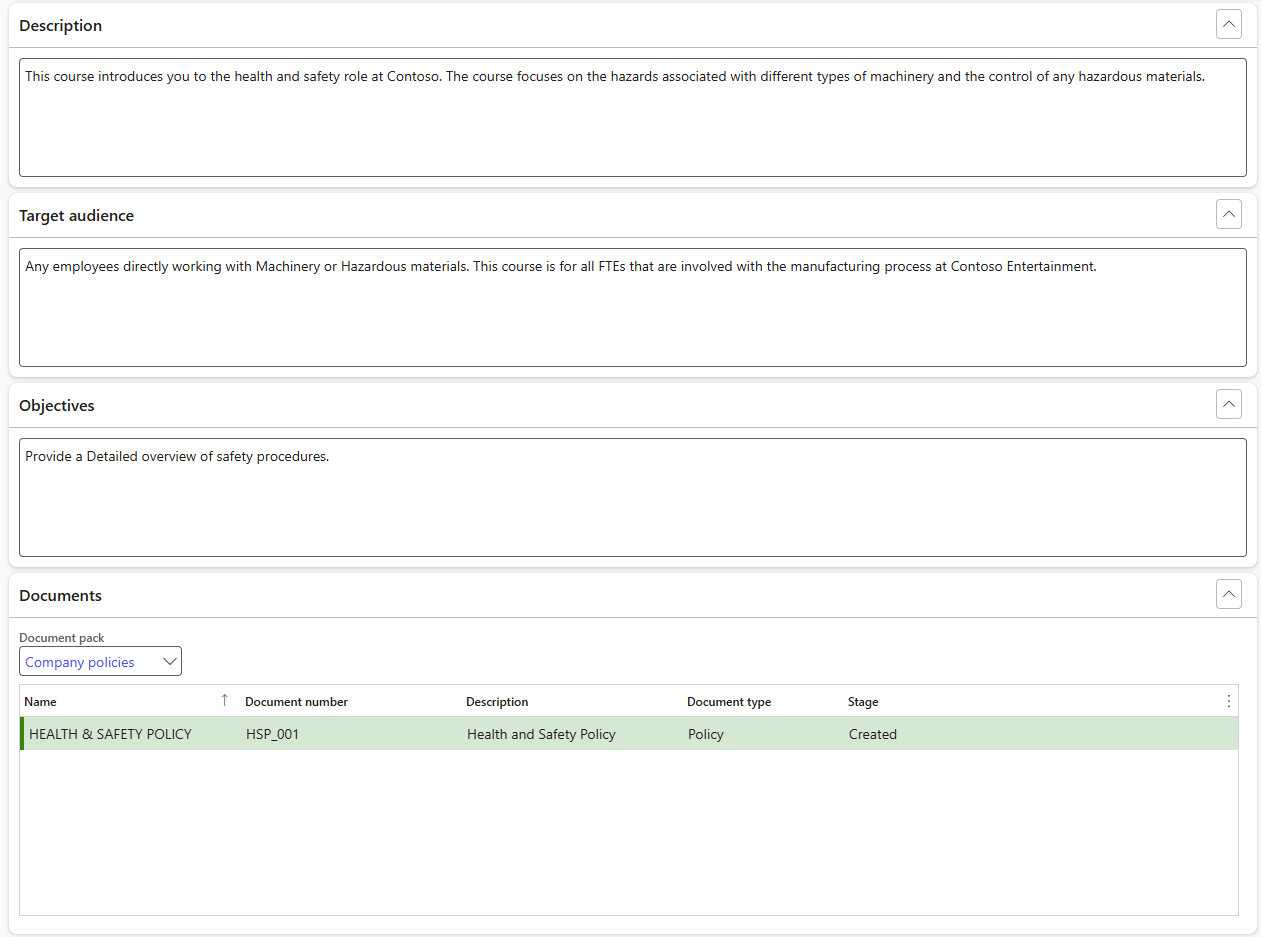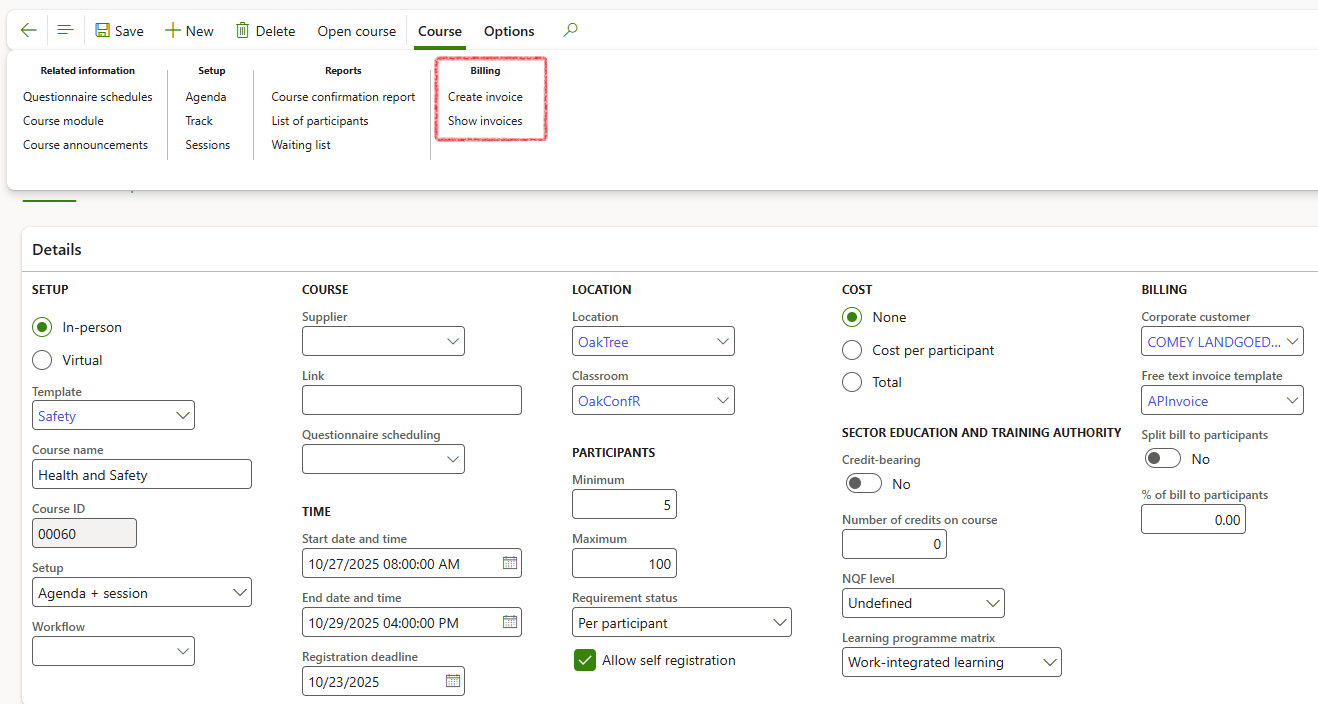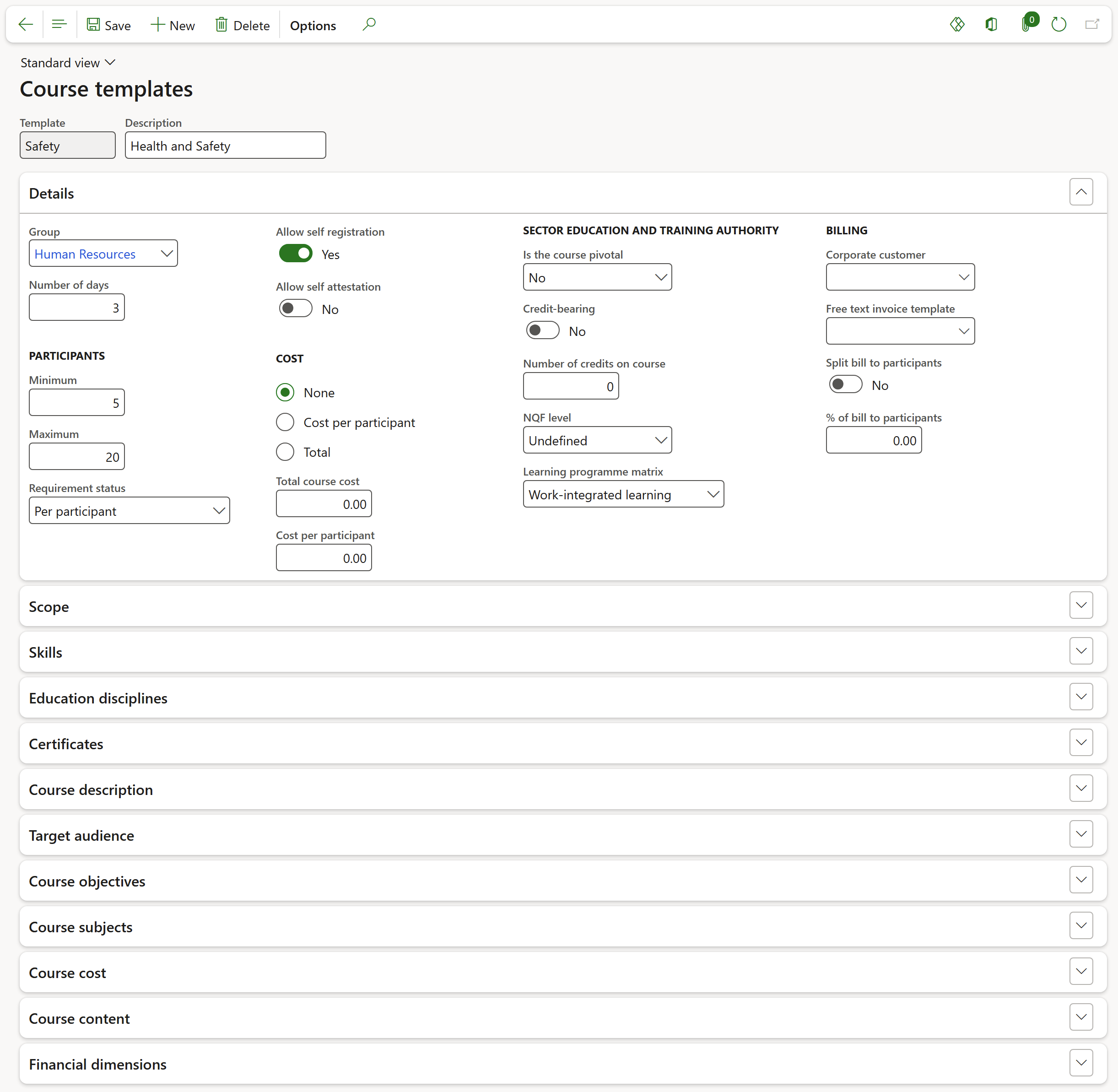 Expand the various Fast tabs to add additional information including as explained in Course template creation in previous steps and as per standard D365 practice:
