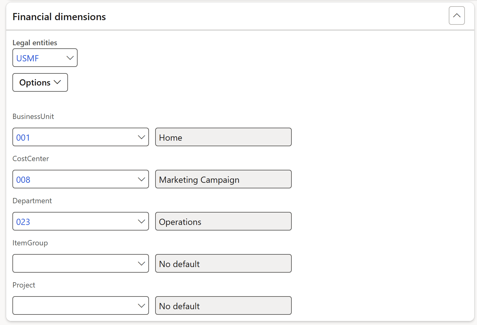 Expand the Financial dimensions Fast tab to complete the relevant fields
