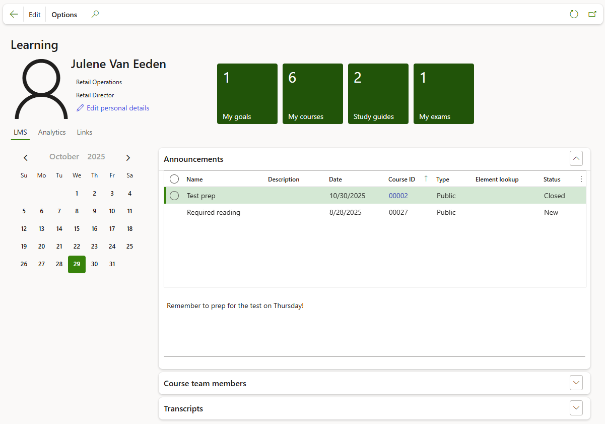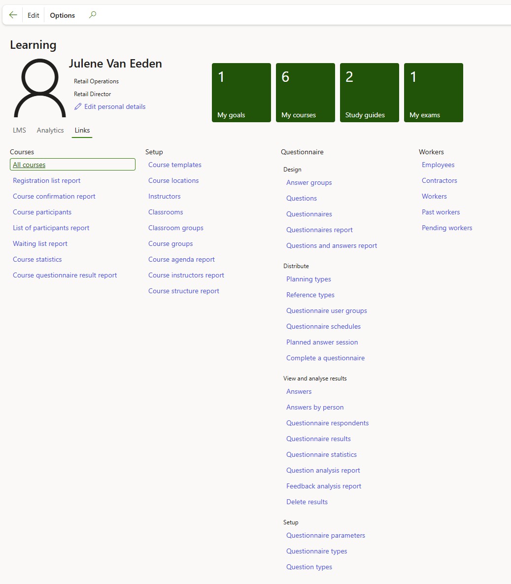 Access the Learning workspace directly from the F&O home or from Human Resources workspaces menu.
