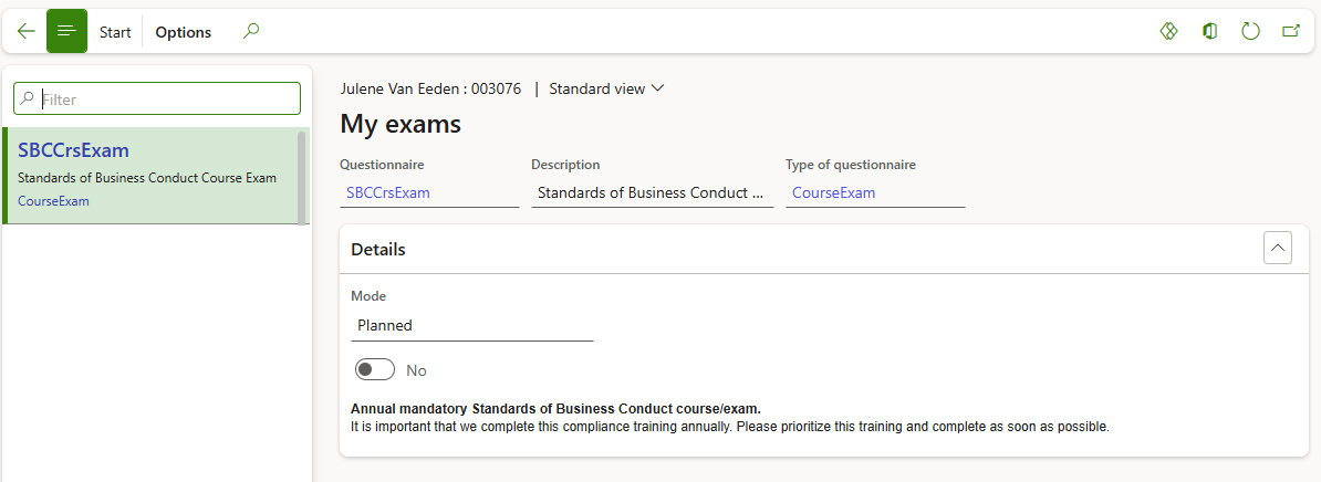 Select the appropriate exam, then click on Start in the action pane to complete the exam questionnaire