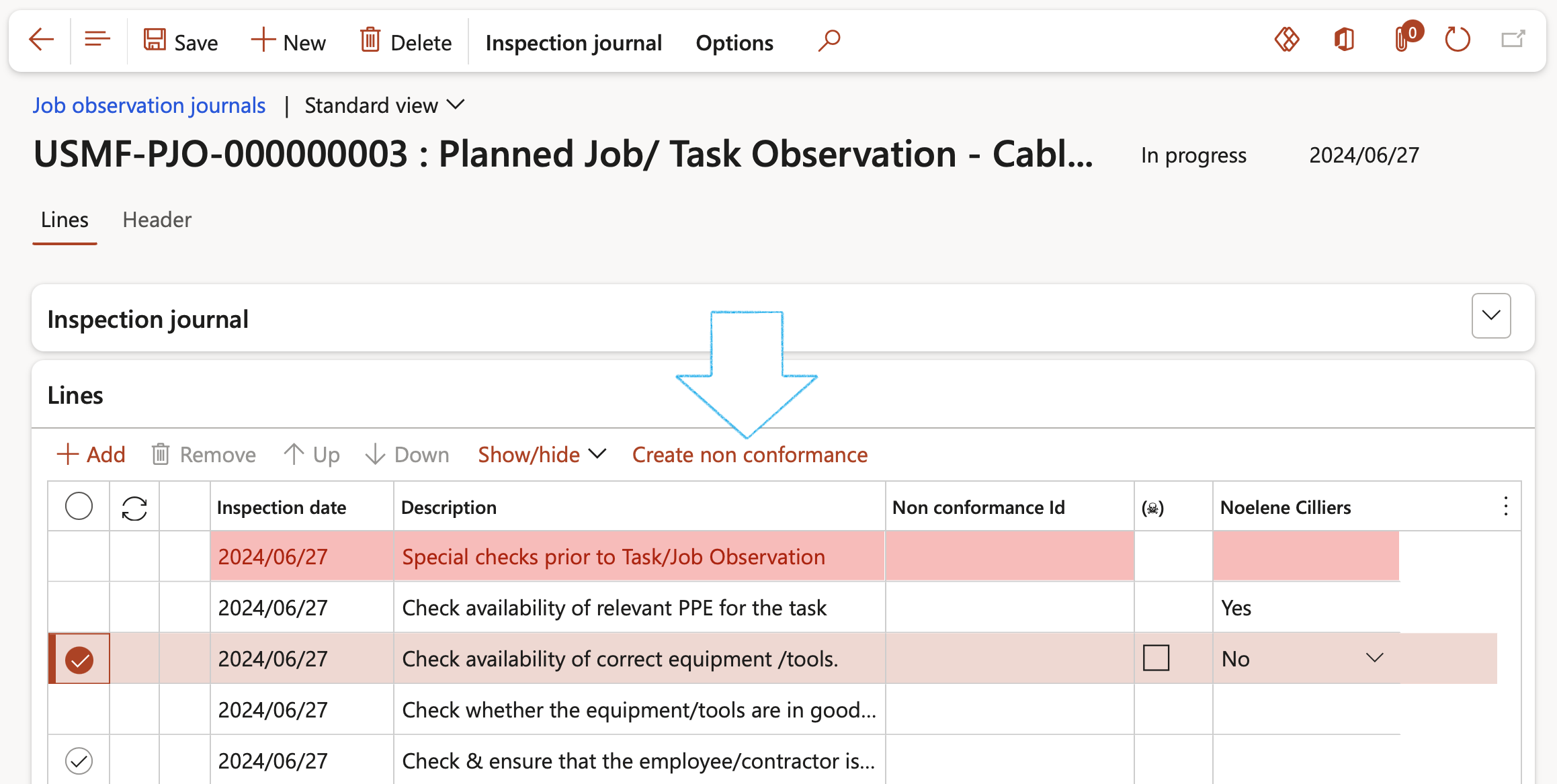 On the Action pane, in the Findings group, click on the Create non-conformance button