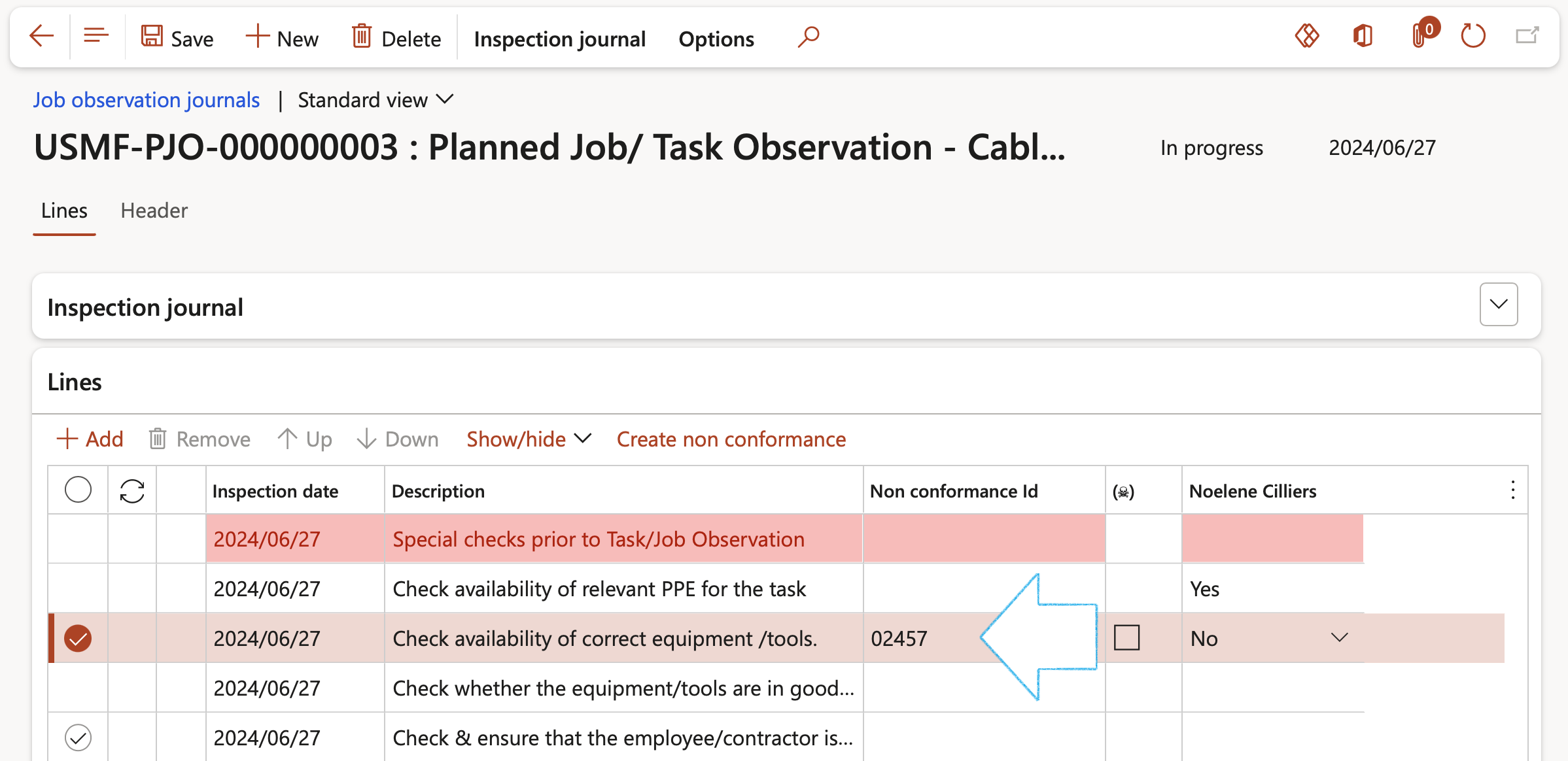 The Hazard column under the Lines Fast tab on the Inspection journal, will only be visible when the Inspection type = Behaviour/Safety/Construction