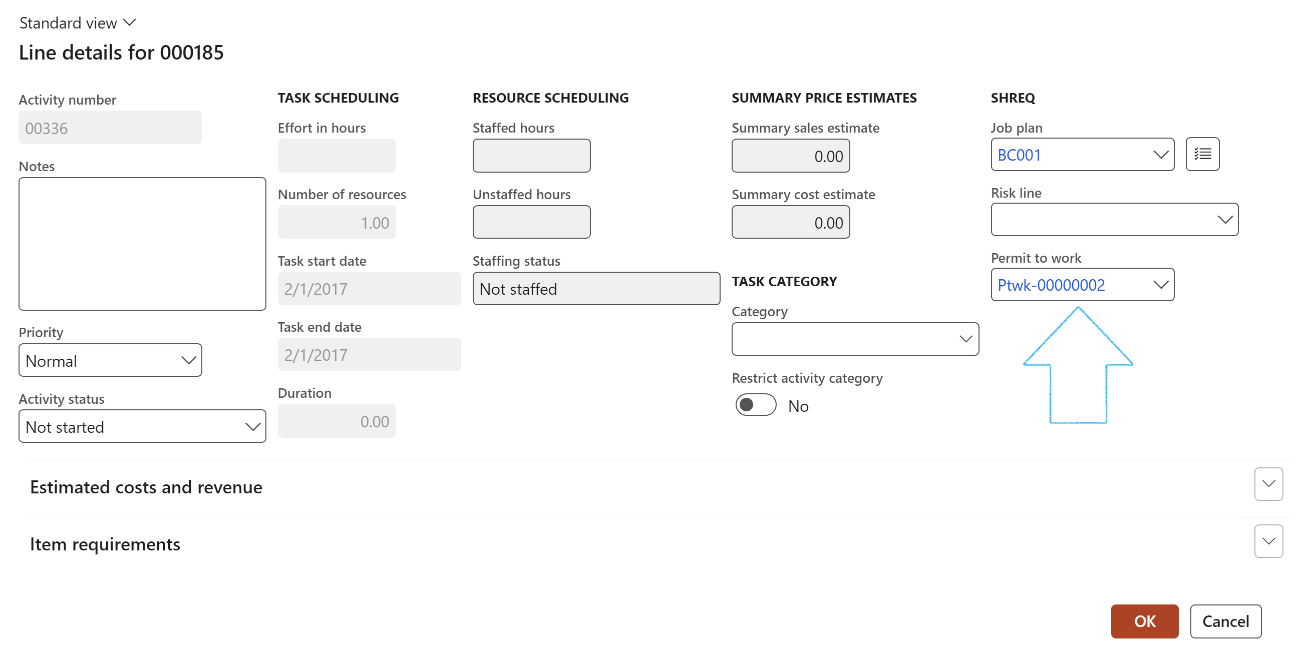When creating a Permit to work from the Work order line, users will be given the option to copy the work description text, found on the Work order line details (Description Index tab) to the Work to be performed Fast tab (on the Permit to work header).